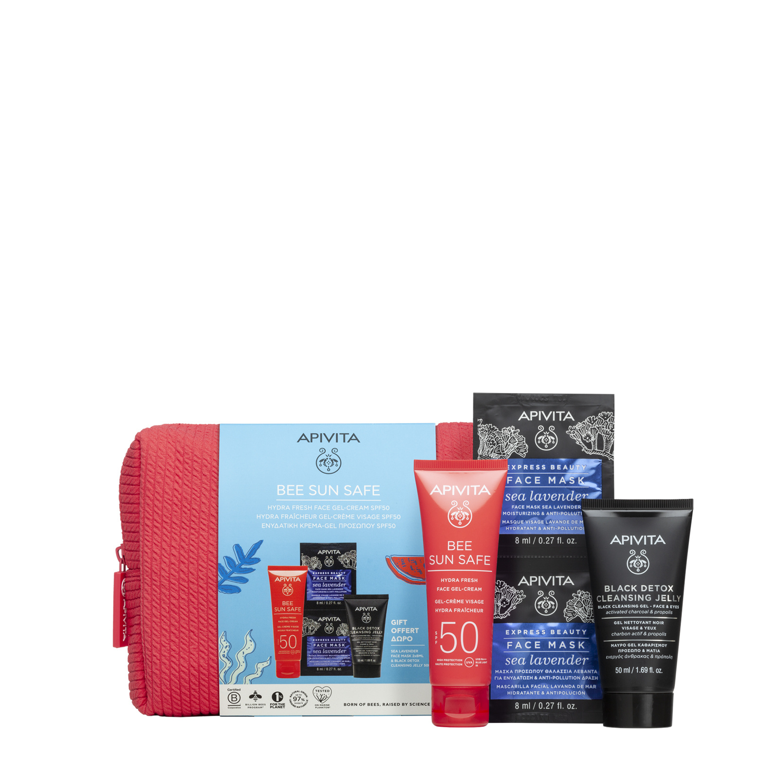 Oλοκληρωμένο σετ φροντίδας προσώπου για υψηλή αντηλιακή προστασία και ενυδάτωση, σε συλλεκτικό κοραλλί καλοκαιρινό τσαντάκι. Ιδανικό για ταξίδι και για την παραλία!Το σετ περιλαμβάνει:ΒΕΕ SUN SAFE ενυδατική κρέμα-gel προσώπου SPF50 (50ml): Αντηλιακή κρέμα με ελαφριά, μη λιπαρή, cream-gel υφή, που απορροφάται άμεσα και αφήνει την επιδερμίδα φρέσκια και ενυδατωμένη. Χαρίζει προστασία από τις ακτίνες UVA, UVB, IR & BLUE LIGHT και προστασία από την πρόωρη γήρανση. Πολύ ανθεκτική στο νερό. Μη φαγεσωρογόνος. Κατάλληλη και για ευαίσθητες επιδερμίδες.Μαύρο Gel Καθαρισμού για Πρόσωπο & Μάτια με Ενεργό Άνθρακα & Πρόπολη (50ml): Καθαρίζει και μαγνητίζει ρύπους και μακιγιάζ και αφήνει την επιδερμίδα φρέσκια, καθαρή και άνετη. Προσφέρει extra anti-pollution δράση.Express Beauty Μάσκα Προσώπου Θαλάσσια Λεβάντα για Ενυδάτωση & Anti-pollution Δράση (2x8ml): Ενυδατώνει και αναζωογονεί, προσφέρει αντιοξειδωτική προστασία & anti-pollution δράση, ενδυναμώνει τον επιδερμικό φραγμό.Τα αντηλιακά BEE SUN SAFE, σέβονται την επιδερμίδα και το θαλάσσιο οικοσύστημα. Έχουν “καθαρές” συνθέσεις που περιλαμβάνουν βιοαποκοδομήσιμα συστατικά και έχουν μελετηθεί σε θαλάσσιο πλαγκτόν. Χρησιμοποιούμε υπεύθυνη συσκευασία, από ανακυκλωμένα και ανακυκλώσιμα υλικά.