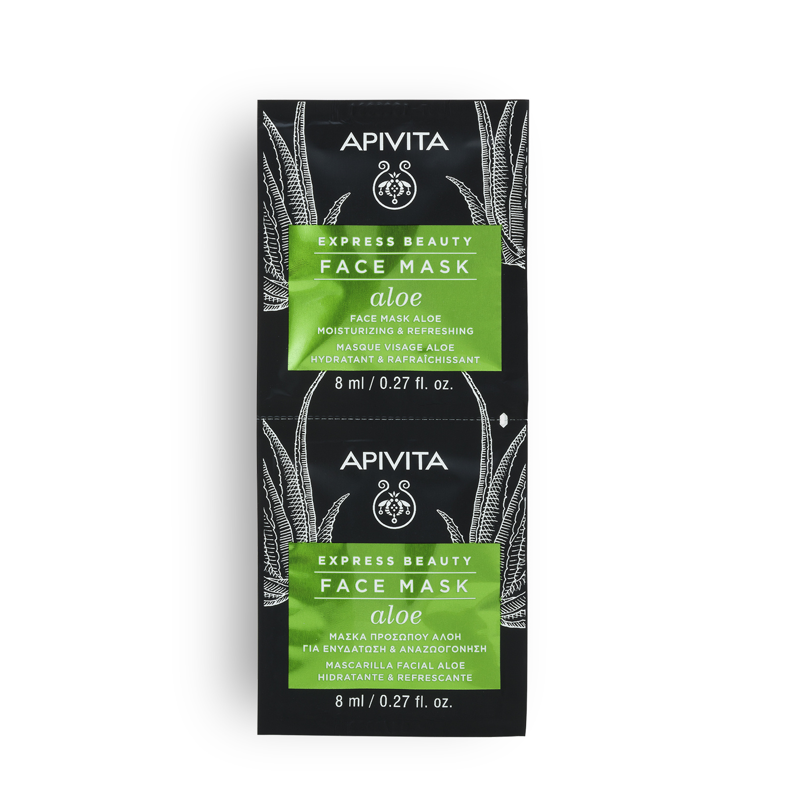 Η μάσκα προσώπου EXPRESS BEAUTY με αλόη, ένα γνωστό θεραπευτικό φυτό που χρησιμοποιείται σαν συμπλήρωμα διατροφής για την τόνωση του οργανισμού, ενυδατώνει και καταπραΰνει άμεσα την επιδερμίδα.Ξεδιψάει και αναπληρώνει την υγρασία της επιδερμίδας χάρη στην αλόη, στο υαλουρονικό οξύ και στο εκχύλισμα τριαντάφυλλουΒελτιώνει την ελαστικότητα της επιδερμίδας χαρίζοντας της απαλή και λεία υφή με λάδι jojoba, έλαιο σιταριού, βούτυρο καριτέ και ελληνικό θυμαρίσιο μέλιΤονώνει και αναζωογονεί με αιθέριο έλαιο περγαμόντοΤο νερό της σύνθεσης έχει αντικατασταθεί με ένα αντιοξειδωτικό έγχυμα από άγριο τριαντάφυλλο.