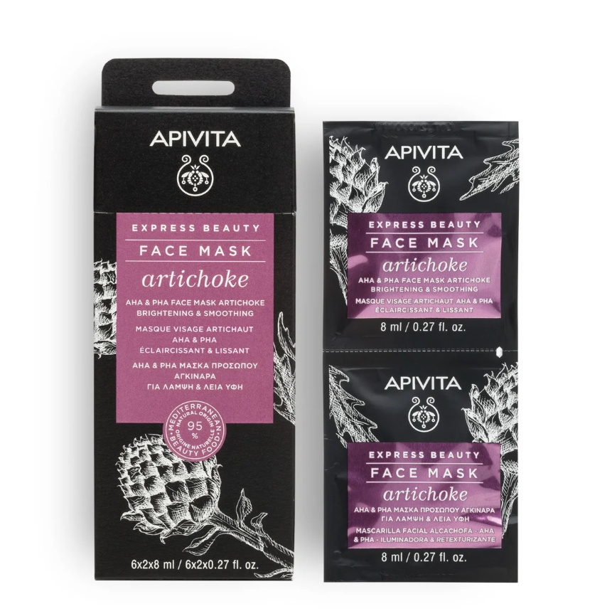 Η EXPRESS BEAUTY AHA & PHA μάσκα προσώπου αγκινάρα, το υπέροχο Μεσογειακό λαχανικό με το εντυπωσιακό μωβ λουλούδι που ανθίζει στις αρχές του καλοκαιριού, χαρίζει λάμψη στην επιδερμίδα, ενώ παράλληλα μειώνει τους πόρους.Χαρίζει λάμψη στην επιδερμίδα & μειώνει τους πόρους με εκχύλισμα Αγκινάρας & Αζελαϊκό οξύΒελτιώνει την υφή & τον χρωματικό τόνο του δέρματος με AHA & PHA, ένα σύγχρονο δραστικό συστατικό, με ήπια απολεπιστική δράση κα φωτο-προστατευτική επίδραση στο δέρμαΕνυδατώνει την επιδερμίδα με Υαλουρονικό οξύΚαταπραΰνει με εκχύλισμα Aloe Vera, Πανθενόλη & Βιταμίνη EΣυνιστάται ιδανικά για ανθρώπους με θαμπή επιδερμίδα, δυσχρωμίες & ορατούς πόρους.Το νερό της σύνθεσης έχει αντικατασταθεί με ένα αντιοξειδωτικό έγχυμα από άγριο τριαντάφυλλο.