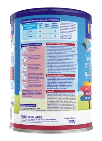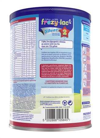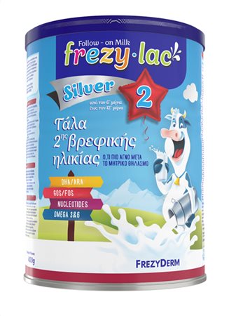 Το FREZYLAC SILVER 2 είναι αγελαδινό γάλα σε σκόνη, κατάλληλο για τη διατροφή του βρέφους από τον 6° μήνα έως τον 12° μήνα στο πλαίσιο μίας μεικτής διατροφής.Βασισμένο στους Κανονισμούς της Ε.Ε. που διέπουν τα παρασκευάσματα για βρέφη και τα παρασκευάσματα δεύτερης βρεφικής ηλικίας.Περιέχει πρωτεΐνες, βιταμίνες, μέταλλα, υδατάνθρακες, ιχνοστοιχεία, κορεσμένα και πολυακόρεστα λιπαρά οξέα, DHA (όπως απαιτείται από τη νομοθεσία για όλα τα παρασκευάσματα για βρέφη), ARA, ω-3 και ω-6 λιπαρά οξέα, Νουκλεοτίδια, Πρεβιοτικά (GOS/FOS) και καλλιέργειες Bifidus (Bifidobacterium lactis)- Χωρίς GMO (γενετικά τροποποιημένους παράγοντες)- Χωρίς γλουτένη- Συσκευασμένο σε προστατευτική ατμόσφαιρα*Το μητρικό γάλα είναι η ιδανική τροφή για τα βρέφη. Ο αποκλειστικός μητρικός θηλασμός κατά το πρώτο εξάμηνο της ζωής είναι ιδανικός για το μωρό σας. Όταν ο θηλασμός είναι αδύνατος ή δεν επαρκεί συμβουλευτείτε τον παιδίατρο για την εισαγωγή στη διατροφή του μωρού σας βρεφικού γάλακτος. Η έναρξη διατροφής με μπιμπερό μπορεί να έχει αρνητικές επιπτώσεις στο θηλασμό.Δείτε εδώ τον Πίνακα Καθημερινής Διατροφής και Ανασύστασης του FREZYLAC SILVER 2Δείτε εδώ χρήσιμες συμβουλές και σημαντικές πληροφορίες για τους γονείς