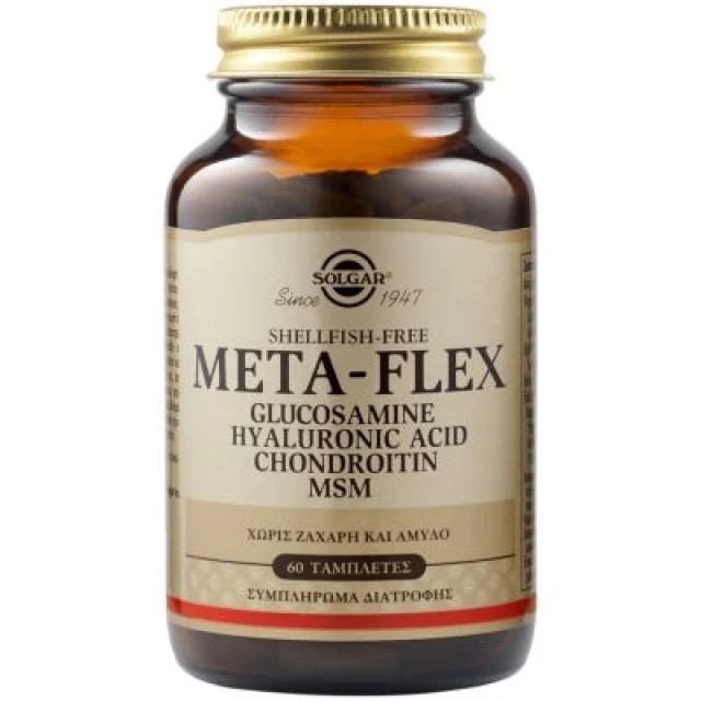 H προηγμένη φόρμουλα SOLGAR Meta-Flex χωρίς οστρακοειδή ξεχωρίζει ανάμεσα στα συμπληρώματα διατροφής για τις αρθρώσεις, καθώς περιέχει σε 1 ταμπλέτα: